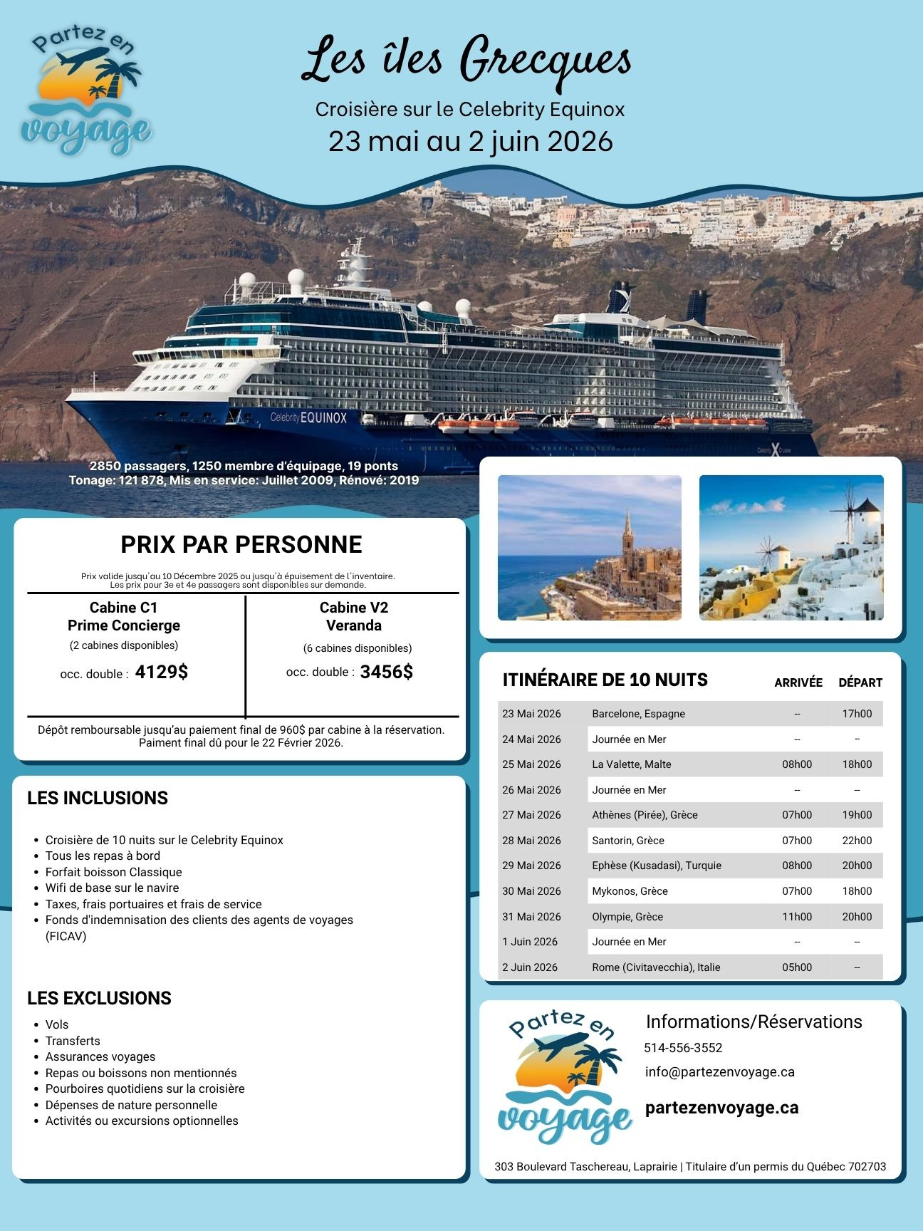 Set sail on an unforgettable journey through the Greek Islands aboard the elegant Celebrity Equinox. From Barcelona to Rome, explore Malta, Athens, Santorini, Ephesus, Mykonos, and Olympia during a 10-night Mediterranean voyage filled with beauty, culture, and relaxation.